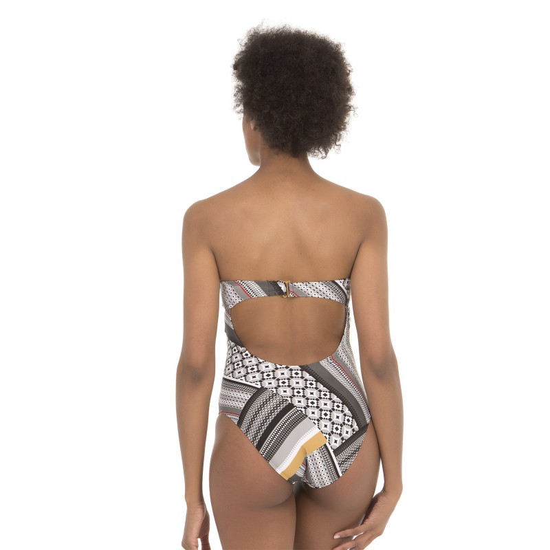Bañador de mujer bandeau con copa interior y aro. Con tirantes extraíbles y estampado pañuelo. De color negro.