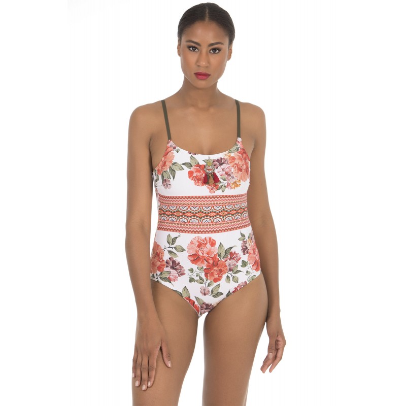 Bañador de mujer de escote alto cuadrado. Con aro y sin copa de foam. Con estampado de greca colorido y un pequeño adorno en el escote. Muy veraniego y en tendencia. De color blanco.