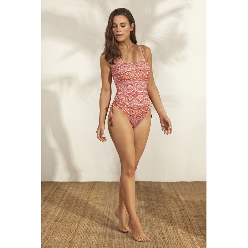 Bañador de mujer de escote cuadrado. Con copa interior, sin aro y tirantes cruzados. Con su diseño étnico en colores vivos, esta pieza te hará brillar este verano.
