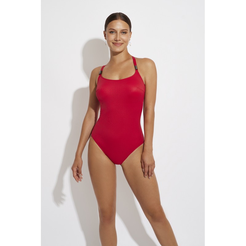 Bañador de mujer de escote cuadrado. Con copa interior, sin aro y tirantes cruzados. Con un detalle que aporta elegancia a esta pieza y lo convierte en una alternativa ideal entre tus prendas de baño.