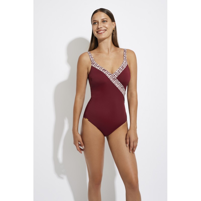 Bañador de mujer con escote en pico. Sin aro y con copa interior de foam. Con un bonito estampado étnico, ideal para crear un look playero o de piscina discreto y elegante.