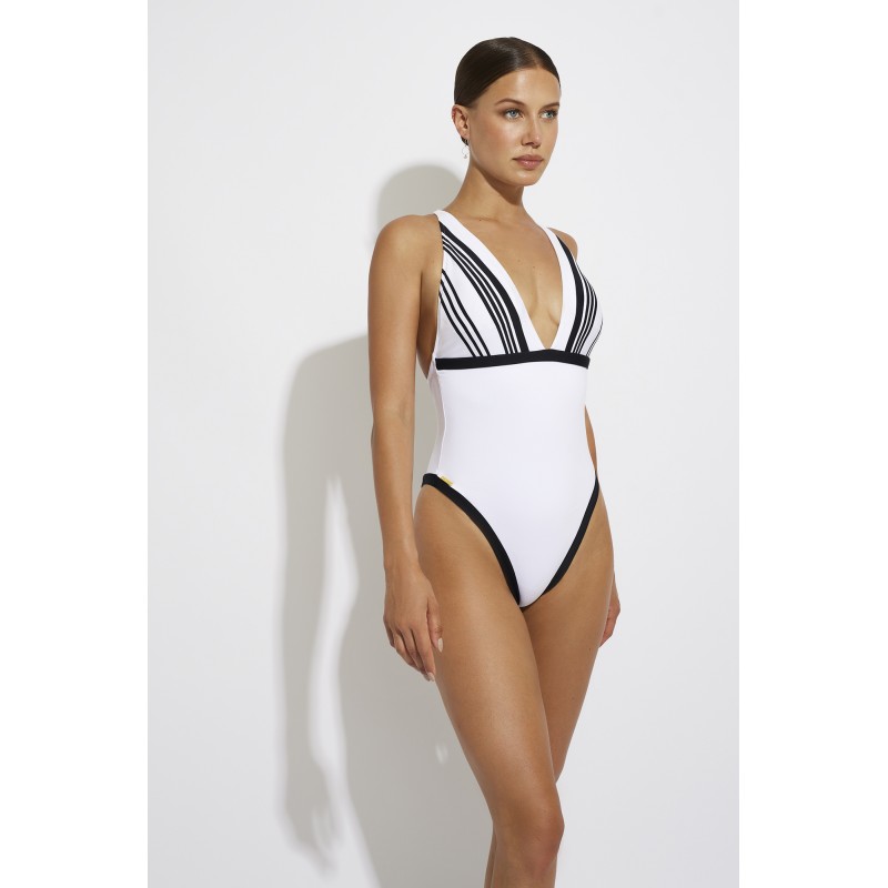 Bañador escotado triangular sin copa interior y sin aro. Su diseño en blanco y negro le otorga un estilo retro, elegante y seductor.