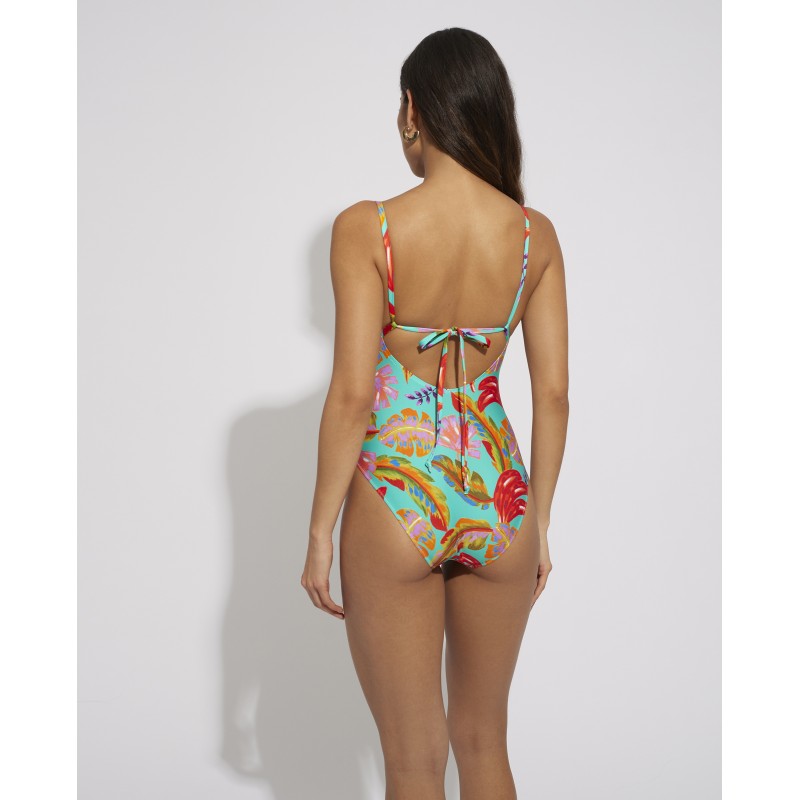 Bañador escotado triangular de mujer sin copa interior y sin aro. Con un estampado colorido y vibrante que le dará frescura y vida a tus días de playa o piscina.