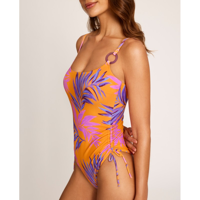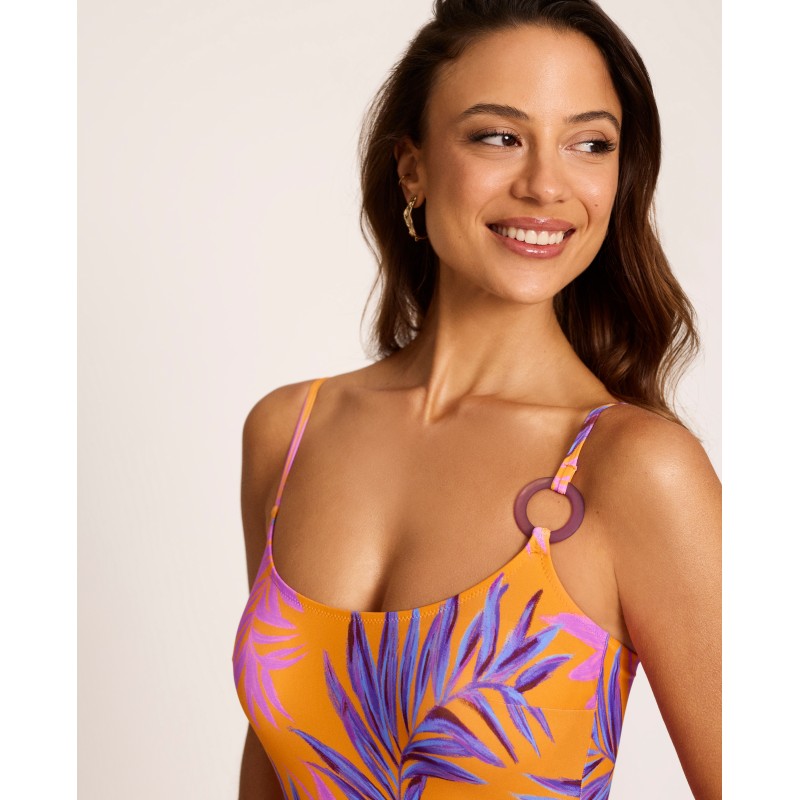 Bañador de mujer de escote alto cuadrado con tirantes multiposición. Con copa interior y sin aro. Con un estampado de inspiración tropical y colores vibrantes que respiran verano. Ideal para disfrutar esta temporada bajo el sol. Confeccionado con materias primas recicladas.