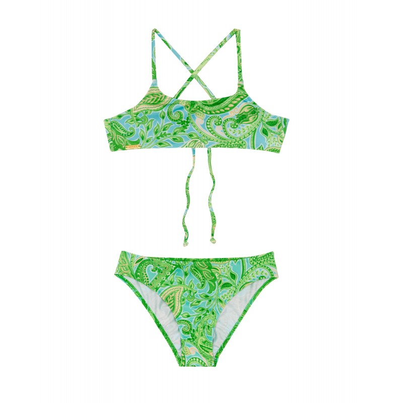 Bikini de niña de dos piezas. Su diseño étnico y colores vibrantes le dan un toque de originalidad y estilo único a esta pieza. Ideal para ir a juego con toda la familia este verano.