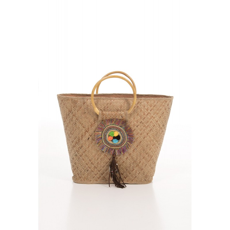 Bolso de playa de rafia con tirantes de caña de bambú. Forrado en el interior y con un adorno en la parte delantera. Perfecto para usar este verano. De color arena.