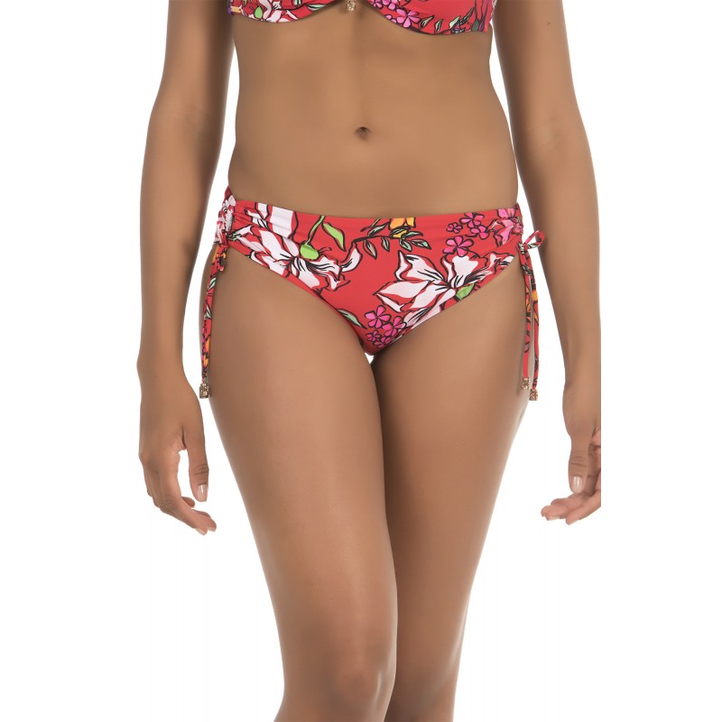 Braga de bikini de cintura alta y corte clásico. Con unos pequeños lazos en las caderas para poder ajustarla. Un diseño sencillo con un diseño muy colorido de flores. De color coral.