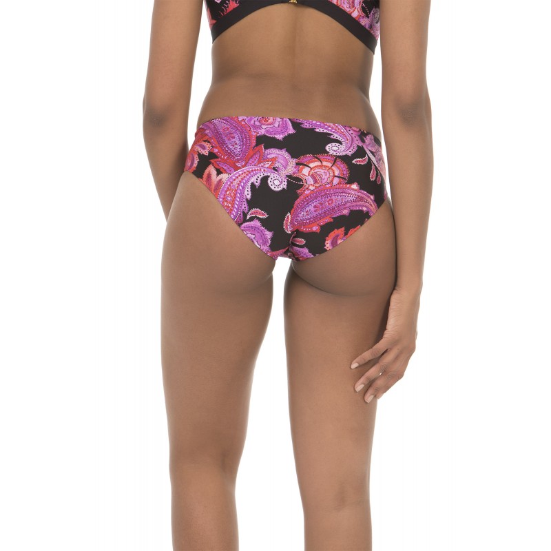 Braga de bikini de cintura alta y corte clásico. Con estampado de cachemire en tonos muy veraniegos. De color negro.