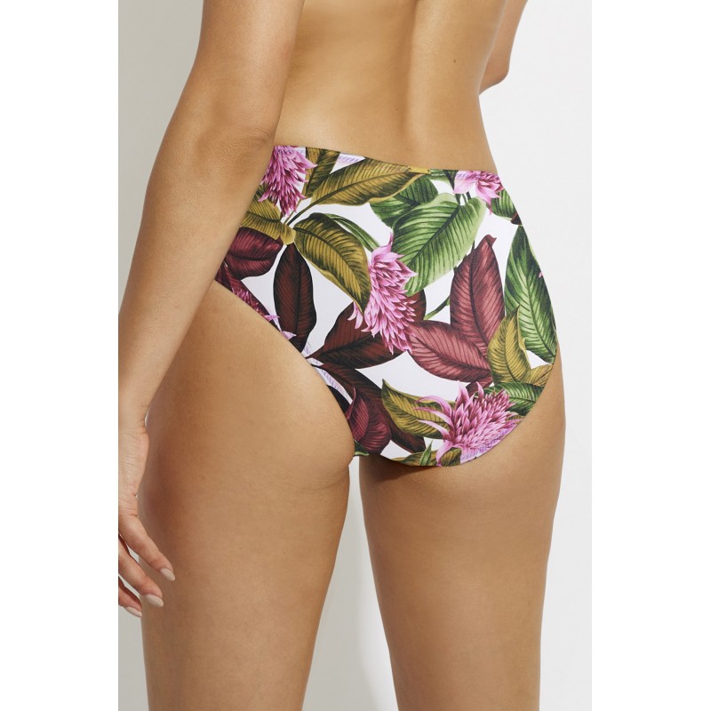 Braga bikini de cintura alta y corte clásico. Un diseño muy veraniego con estampado tropical. Una pieza cargada de color y frescura.