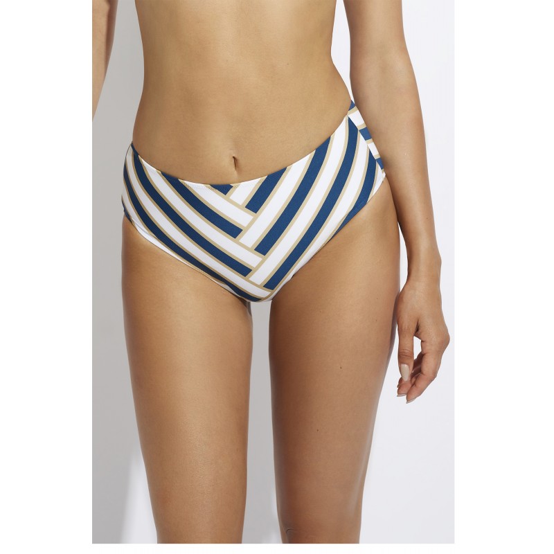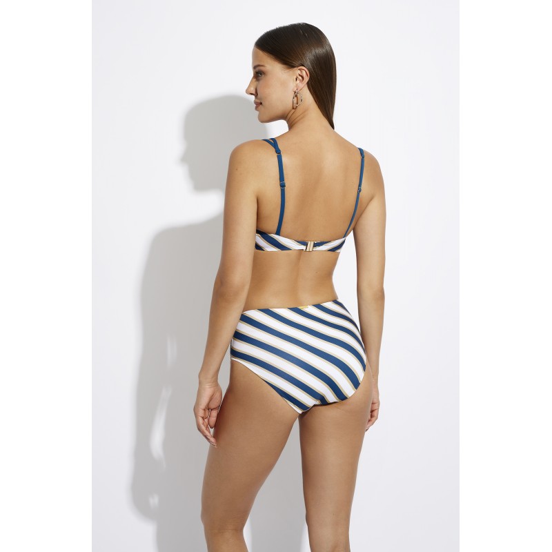 Braga bikini de corte alto. Su diseño trenzado de rayas marineras lo convierte en una pieza estéticamente atractiva y original.