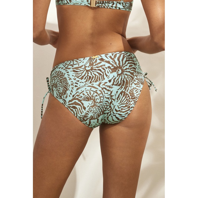 Braga bikini de corte alto y tejido reciclado. Su llamativo diseño étnico de caracolas inspirado en playas soñadas, te cautivará.