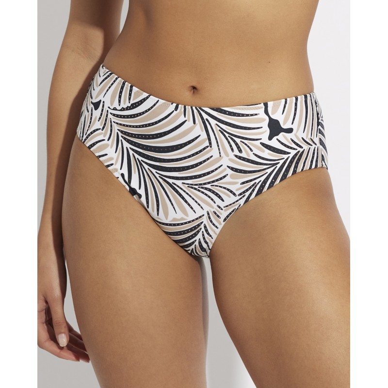 Braga bikini de cintura alta y corte clásico. Este estampado es la elección ideal para quienes buscan un look tropical y fresco. Las hojas de palmeras representan el exotismo y la belleza de los trópicos, transmitiendo una sensación de escapismo y libertad.