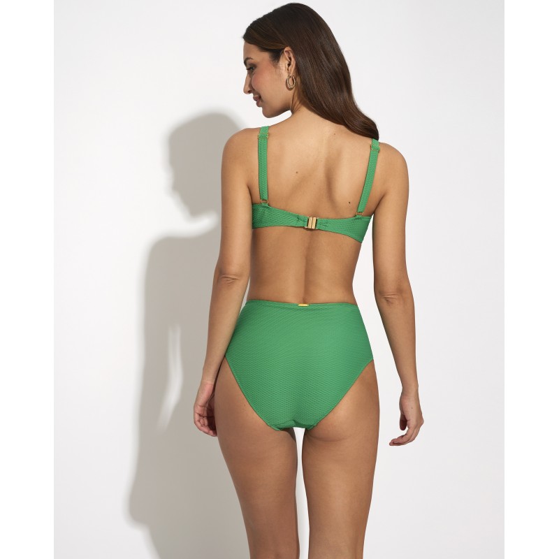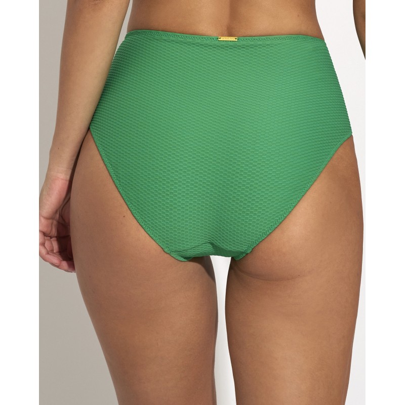 Braga de bikini de cintura alta y corte clásico. Este diseño es sencillo y atemporal, lo que la hace muy versátil y fácil de combinar con diferentes tops de bikini y que no pasa de moda. A su vez, proporciona un ajuste cómodo y seguro.