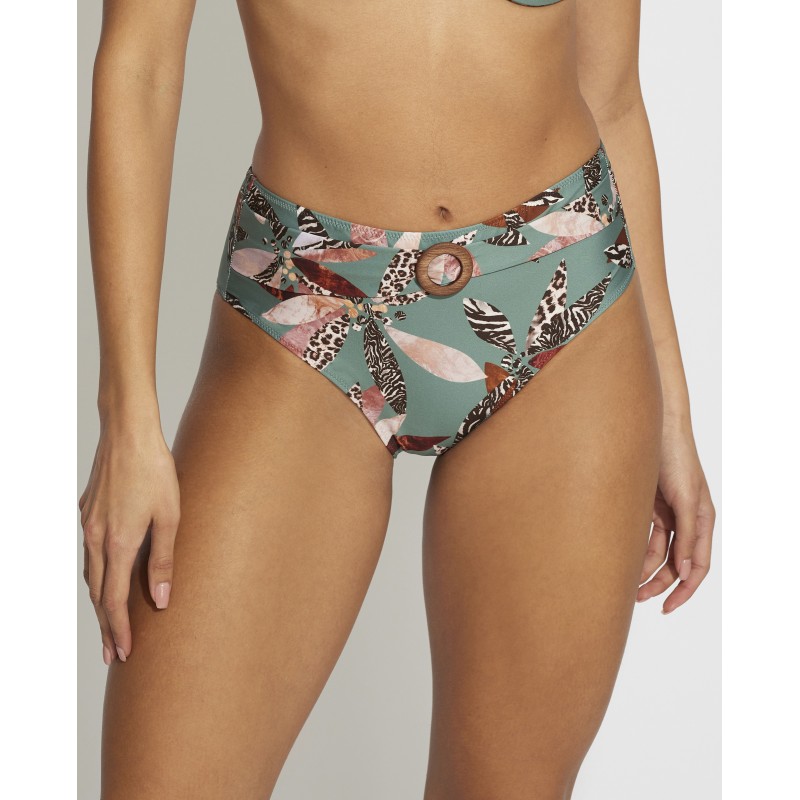 Braga de bikini de cintura alta y corte clásico. Su estampado selvático transmite una sensación de frescura, alegría y exotismo. Es una pieza perfecto para lucir un estilo salvaje y tropical en la playa o la piscina.