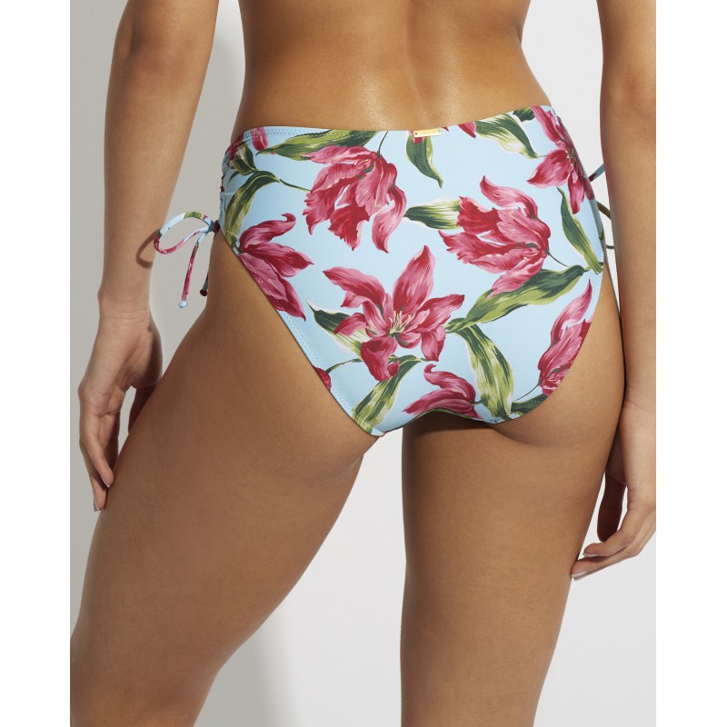 Braga bikini de cintura alta y corte clásico. Con un estampado tropical que evoca la belleza de una isla paradisíaca. Su color y frescura, transmiten la alegría y la energía de la estación más esperada del año.