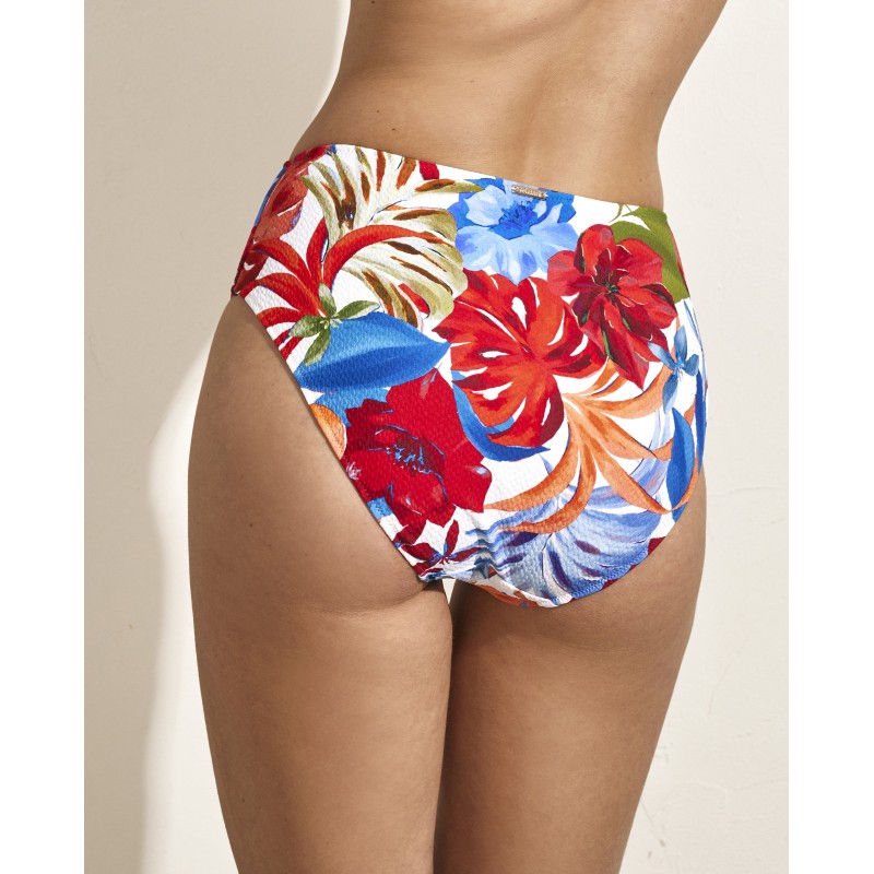 Braga de bikini alta. Con un estampado muy tropical lleno de colores brillantes que evocan el espíritu vacacional.