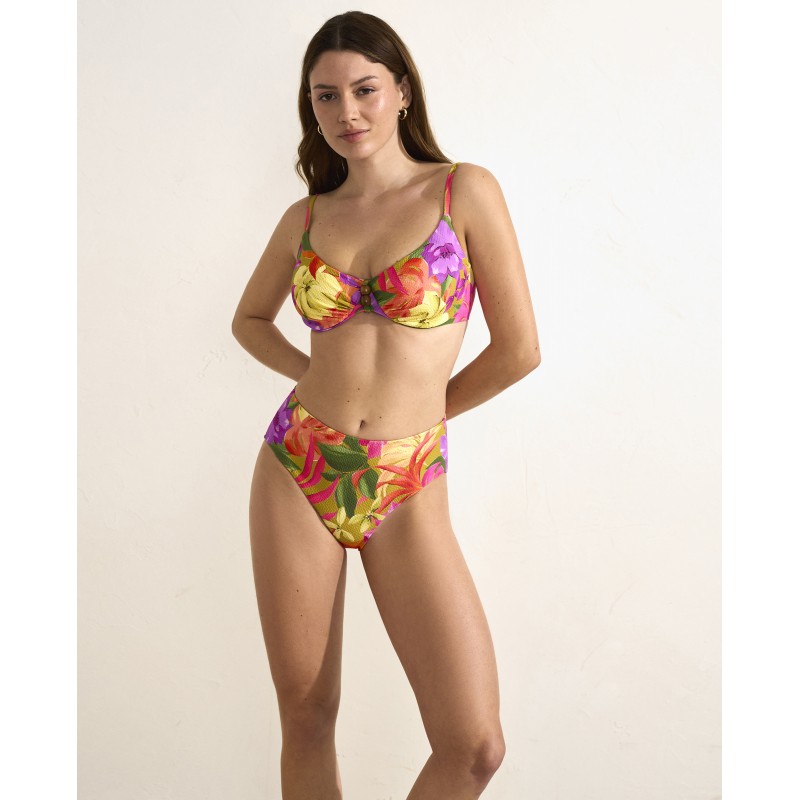 Braga de bikini alta. Con un estampado muy tropical lleno de colores brillantes que evocan el espíritu vacacional.