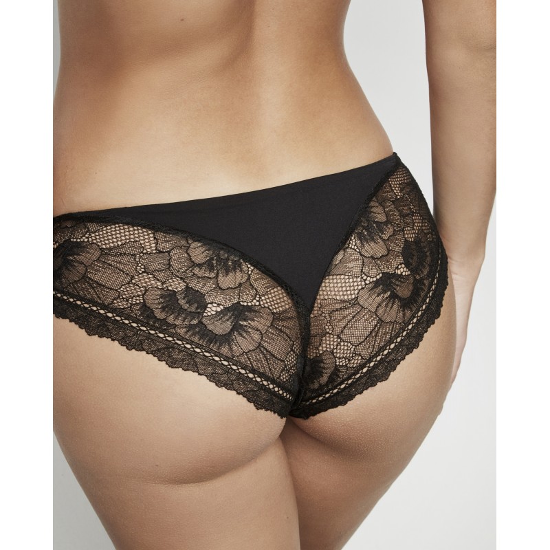 Braguita bikini combinada con encaje floral que continúa de la parte delantera a la trasera, lo que aporta suavidad y detalle exquisito a la prenda. La goma de su cintura no marca. Se trata de una prenda delicada y sofisticada. La colección Agatha, a la que pertenece, encarna la madurez y el esplendor de la marca, ofreciendo piezas que no solo adornan, sino que transforman. Una colección con encanto y carisma.