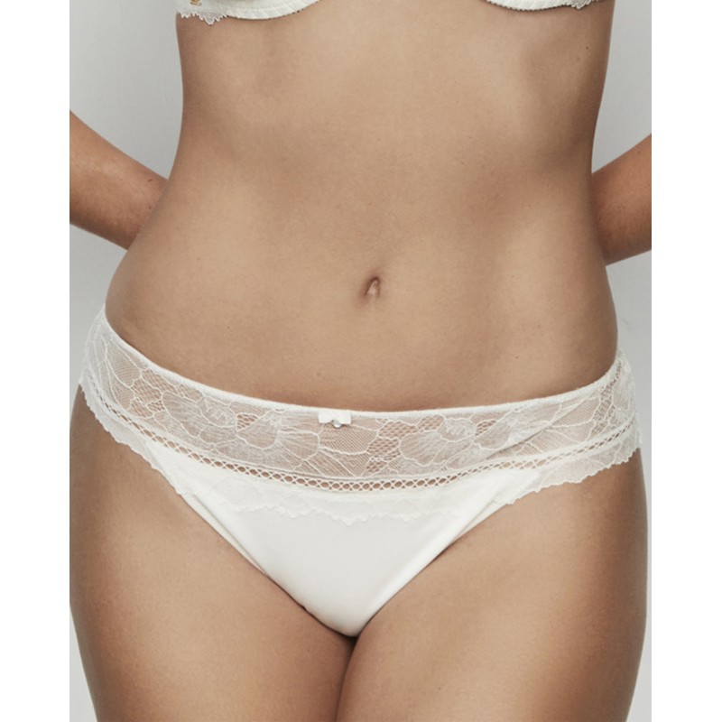 Braguita bikini combinada con encaje floral que continúa de la parte delantera a la trasera, lo que aporta suavidad y detalle exquisito a la prenda. La goma de su cintura no marca. Se trata de una prenda delicada y sofisticada. La colección Agatha, a la que pertenece, encarna la madurez y el esplendor de la marca, ofreciendo piezas que no solo adornan, sino que transforman. Una colección con encanto y carisma.