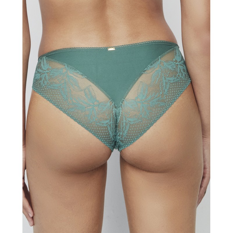 Braguita bikini de corte clásico con encaje floral en los laterales de la parte delantera y trasera, lo que aporta suavidad y detalle exquisito a la prenda. La goma de su cintura no marca. La colección Malitzia, a la que pertenece, representa una danza perfecta entre lo delicado y lo atrevido.