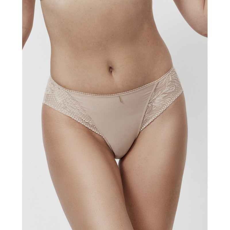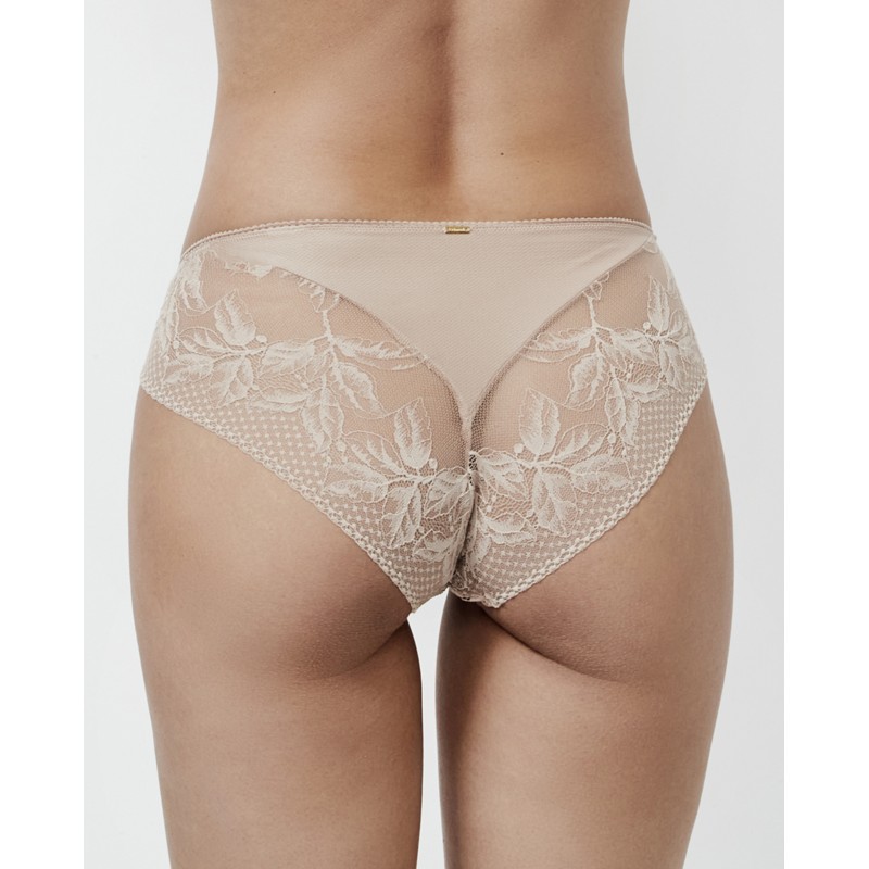 Braguita bikini de corte clásico con encaje floral en los laterales de la parte delantera y trasera, lo que aporta suavidad y detalle exquisito a la prenda. La goma de su cintura no marca. La colección Malitzia, a la que pertenece, representa una danza perfecta entre lo delicado y lo atrevido.