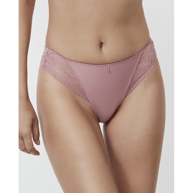 Braguita bikini de corte clásico con encaje floral en los laterales de la parte delantera y trasera, lo que aporta suavidad y detalle exquisito a la prenda. La goma de su cintura no marca. La colección Malitzia, a la que pertenece, representa una danza perfecta entre lo delicado y lo atrevido.