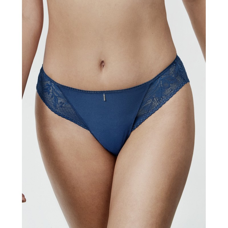 Braguita bikini de corte clásico con encaje floral en los laterales de la parte delantera y trasera, lo que aporta suavidad y detalle exquisito a la prenda. La goma de su cintura no marca. La colección Malitzia, a la que pertenece, representa una danza perfecta entre lo delicado y lo atrevido.