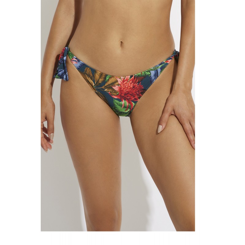 Braga de bikini de tiro bajo con nudos ajustables. Un diseño muy veraniego con estampado tropical. Una pieza cargada de color y frescura.