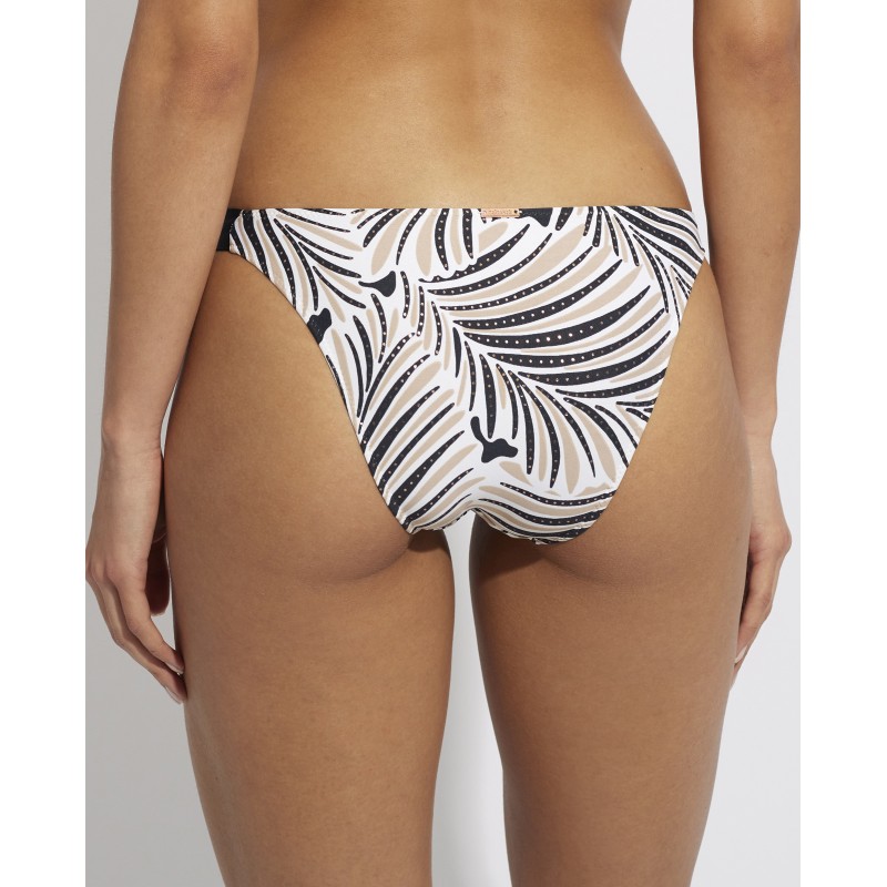 Braga de bikini de tiro bajo con nudos ajustables. Este estampado es la elección ideal para quienes buscan un look tropical y fresco. Las hojas de palmeras representan el exotismo y la belleza de los trópicos, transmitiendo una sensación de escapismo y libertad.