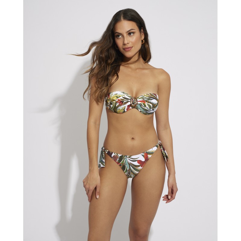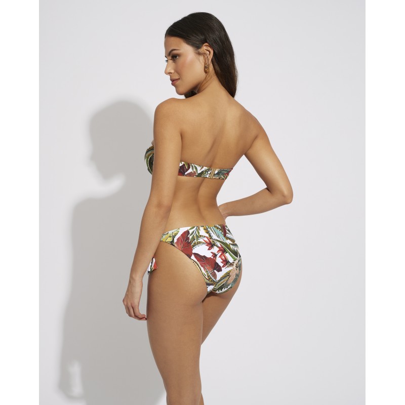 Braga de bikini de tiro bajo con nudos ajustables. Este espectacular diseño con tonos vibrantes inspirado en la flora y fauna salvaje refleja la exuberancia y vitalidad de la naturaleza salvaje tropical.