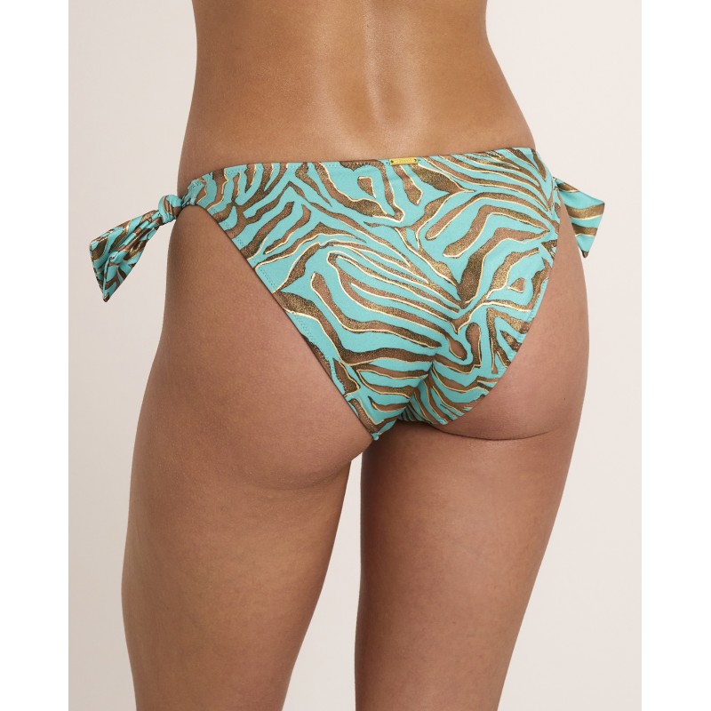 Braga de bikini tiro bajo con nudos laterales. Con un estampado animal print de trazo orgánico que transmite instinto, fuerza y libertad, celebrando una feminidad segura y poderosa. Pertenece a la colección Utopía donde lo imposible se transforma en realidad.