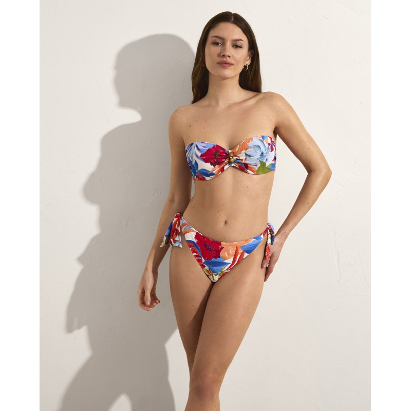 Braga de bikini tiro bajo con nudos laterales. Con un estampado muy tropical lleno de colores brillantes que evocan el espíritu vacacional.