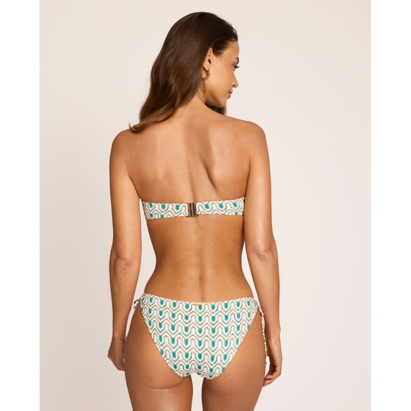 Braga de bikini de tiro bajo con nudos laterales. Con un estampado geométrico que aporta dinamismo y un aire veraniego. Una propuesta contemporánea y sofisticada para esta temporada. Está confeccionado con materiales reciclados.