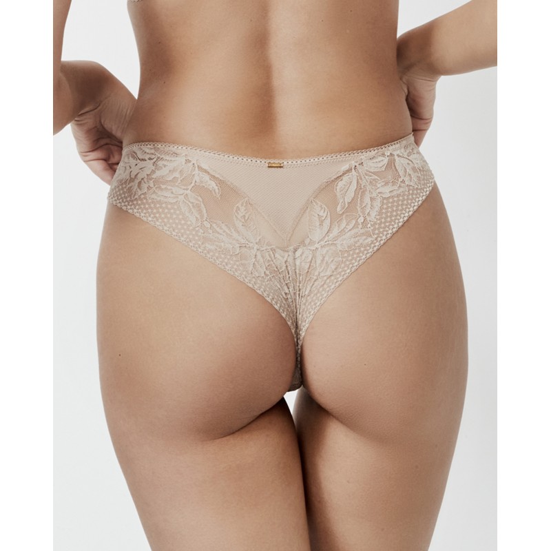 Braguita de corte brasileño con encaje floral que continúa de la parte delantera a la trasera, lo que aporta suavidad y detalle exquisito a la prenda. La goma de su cintura no marca. La colección Malitzia, a la que pertenece, representa una danza perfecta entre lo delicado y lo atrevido.