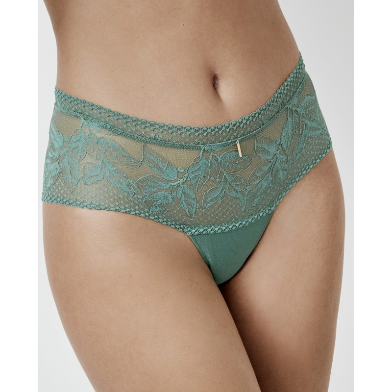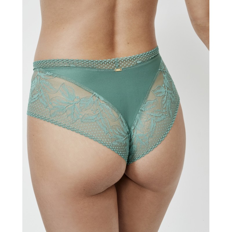 Braguita de corte culotte con encaje floral en parte delantera y trasera, lo que aporta suavidad y detalle exquisito a la prenda. La goma de su cintura no marca. La colección Malitzia, a la que pertenece, representa una danza perfecta entre lo delicado y lo atrevido.