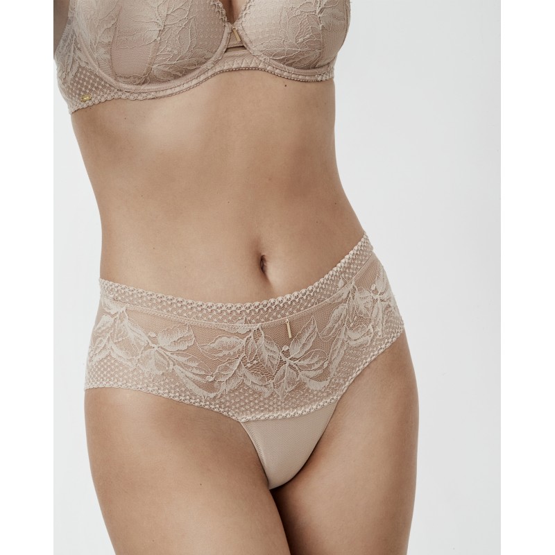 Braguita de corte culotte con encaje floral en parte delantera y trasera, lo que aporta suavidad y detalle exquisito a la prenda. La goma de su cintura no marca. La colección Malitzia, a la que pertenece, representa una danza perfecta entre lo delicado y lo atrevido.