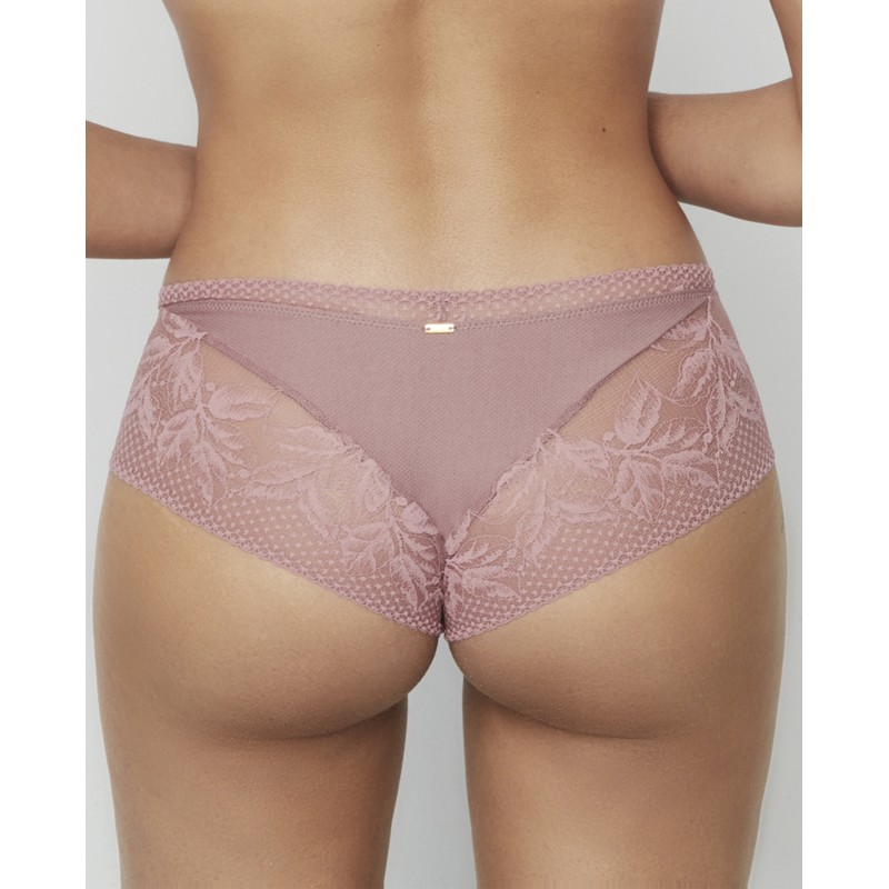 Braguita de corte culotte con encaje floral en parte delantera y trasera, lo que aporta suavidad y detalle exquisito a la prenda. La goma de su cintura no marca. La colección Malitzia, a la que pertenece, representa una danza perfecta entre lo delicado y lo atrevido.