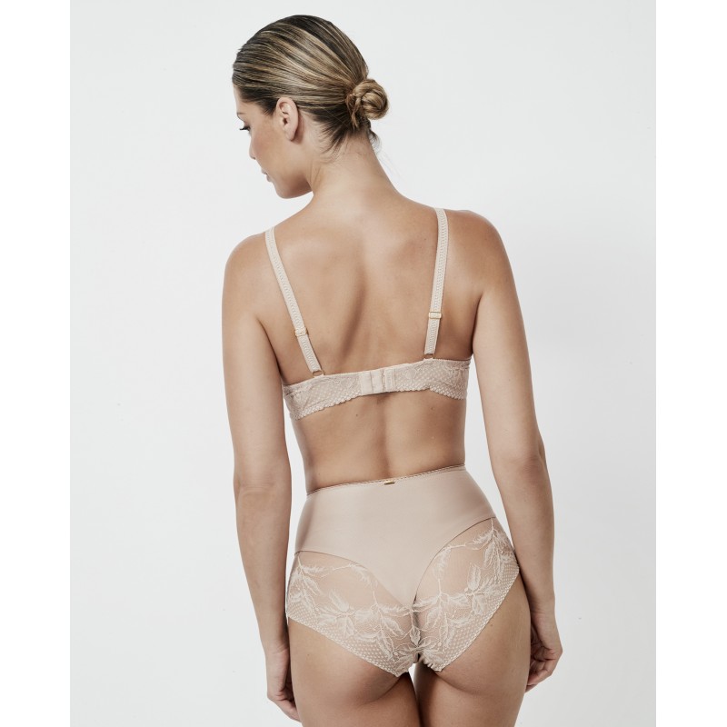 Braguita moldeadora de cintura muy alta con pequeños detalles de encaje floral. Posee tul de control interior. Se trata de una prenda cuidada y sofisticada. La colección Malitzia, a la que pertenece, representa una danza perfecta entre lo delicado y lo atrevido.