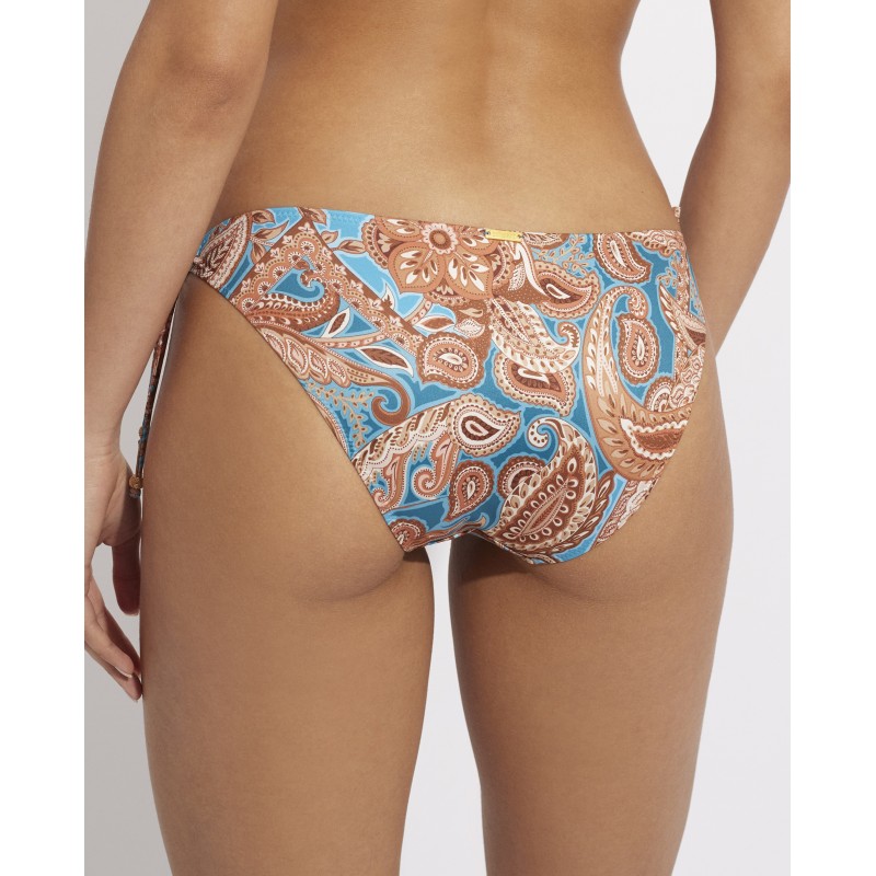 Braga de bikini de tiro bajo con nudos ajustables. Su diseño étnico le da un toque de originalidad y estilo único, haciendo que esta pieza sea diferente a los demás. Sus colores vibrantes resaltan tus curvas de una manera sutil pero impactante.