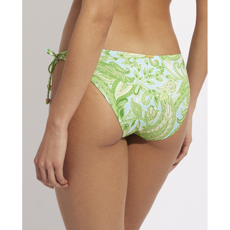 Braga de bikini de tiro bajo con nudos ajustables. Su diseño étnico le da un toque de originalidad y estilo único, haciendo que esta pieza sea diferente a los demás. Sus colores vibrantes resaltan tus curvas de una manera sutil pero impactante.