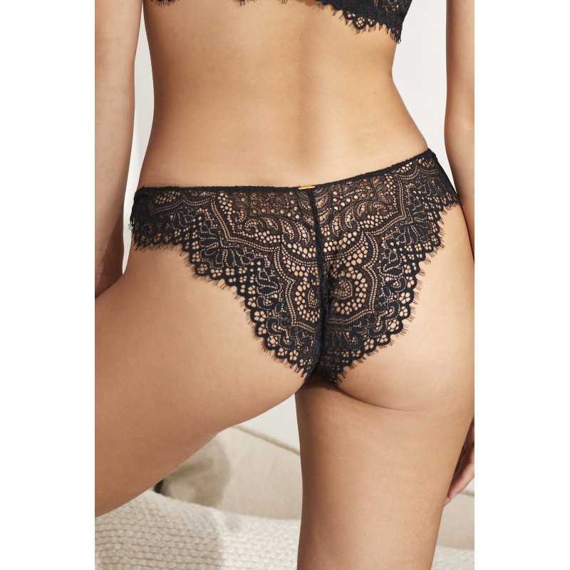 Braguita estilo brasileña. Combina una preciosa blonda geométrica y floral con un sutil adorno dorado. Este diseño inspirado en la diversión y la libertad, es ideal para disfrutar de nuestro lado más salvaje.