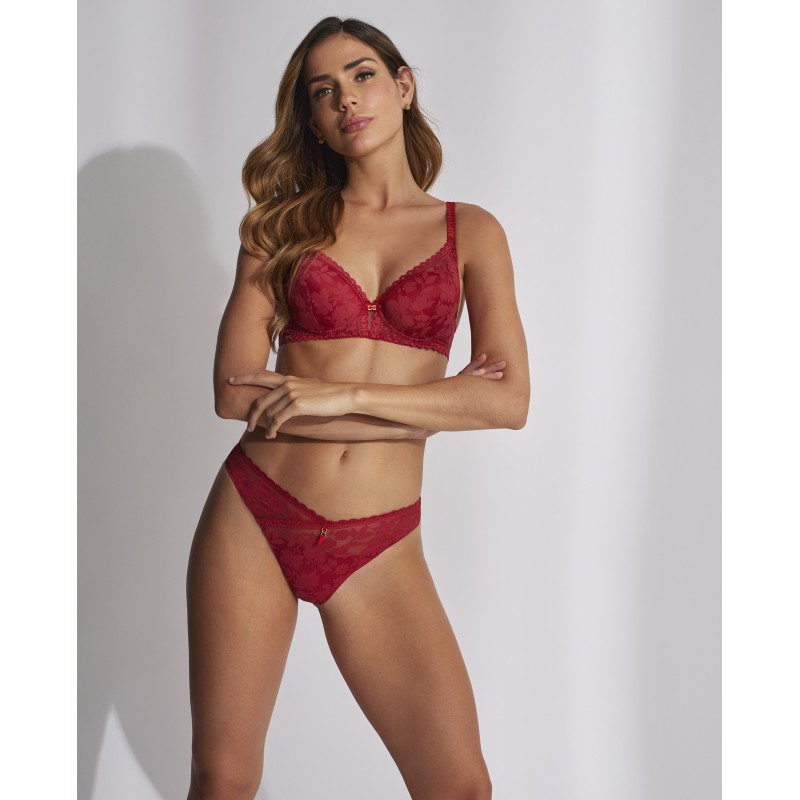 Braguita tanga con delicados detalles de encaje. Esta prenda es una promesa de momentos especiales, un toque de misterio y seducción que transforma el poder de la feminidad en su forma más refinada y cautivadora.