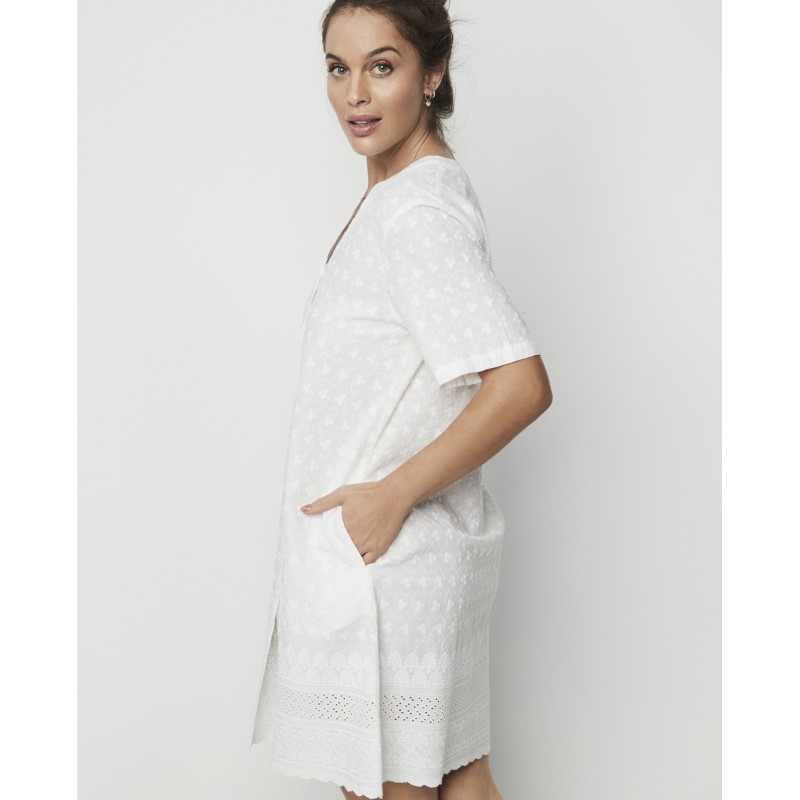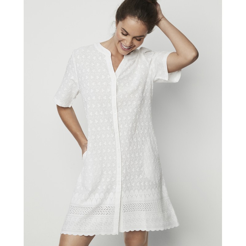 Camisón de manga corta 100% algodón. Cuenta con cierre delantero con botones tipo camisa y cuello estilo mao. Sus detalles de bordado y la cenefa de su bajo lo convierten en una pieza elegante a la par que cómoda y fresca. Ideal para la temporada estival.