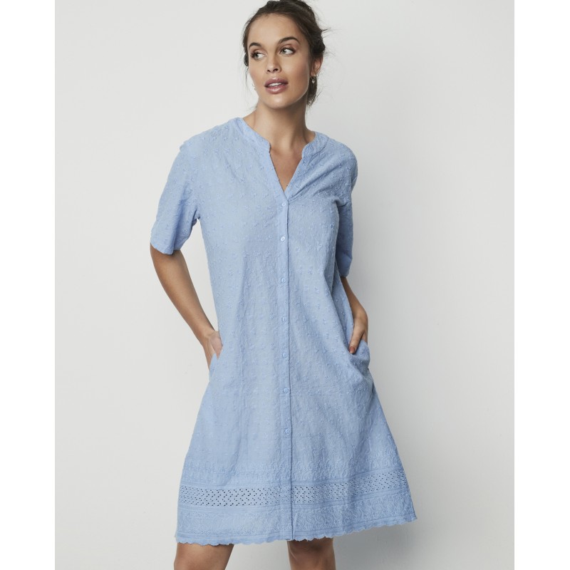 Camisón de manga corta 100% algodón. Cuenta con cierre delantero con botones tipo camisa y cuello estilo mao. Sus detalles de bordado y la cenefa de su bajo lo convierten en una pieza elegante a la par que cómoda y fresca. Ideal para la temporada estival.