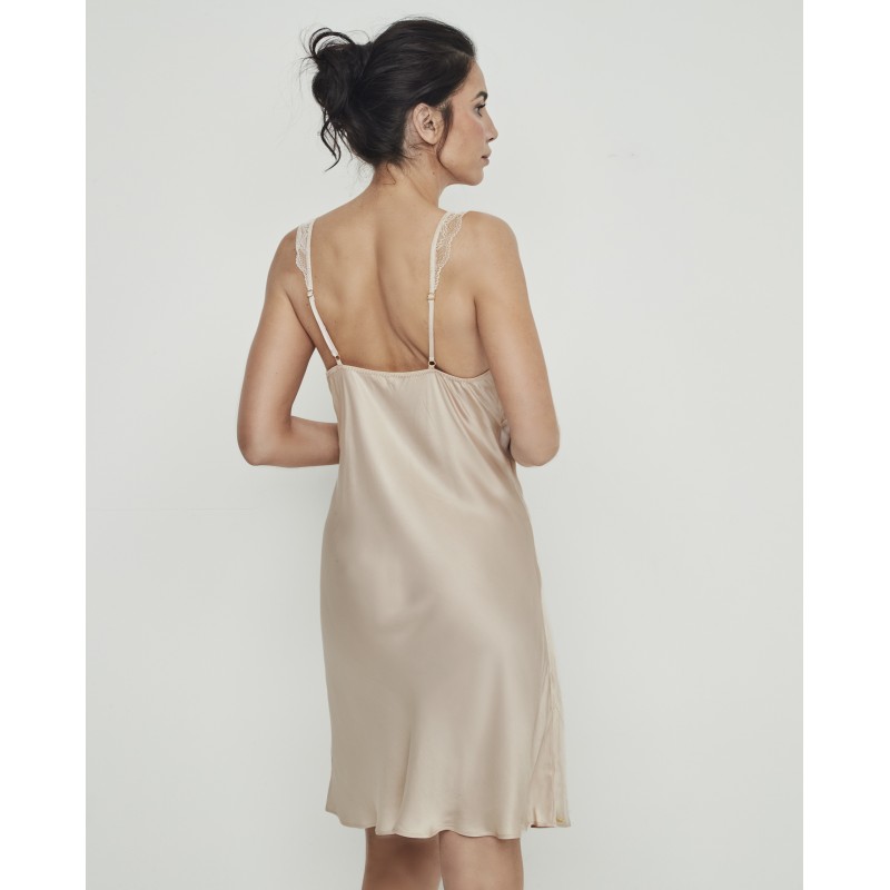 Camisón lencero corto con escote pronunciado triangular y tirantes regulables. Combinado con detalles de encaje y corte halter en la parte trasera. Es una pieza que fusiona elegancia y confort, diseñada para mujeres reales, libres y seguras. Pertenece a la colección Manuela, pensada para realzar la belleza que nace desde dentro celebrando la autenticidad de cada mujer. Para quienes quieren sentirse no solo bellas, sino cómodas y seguras en su propia piel.
