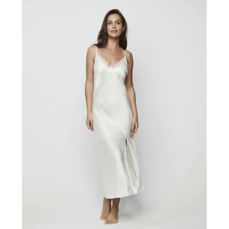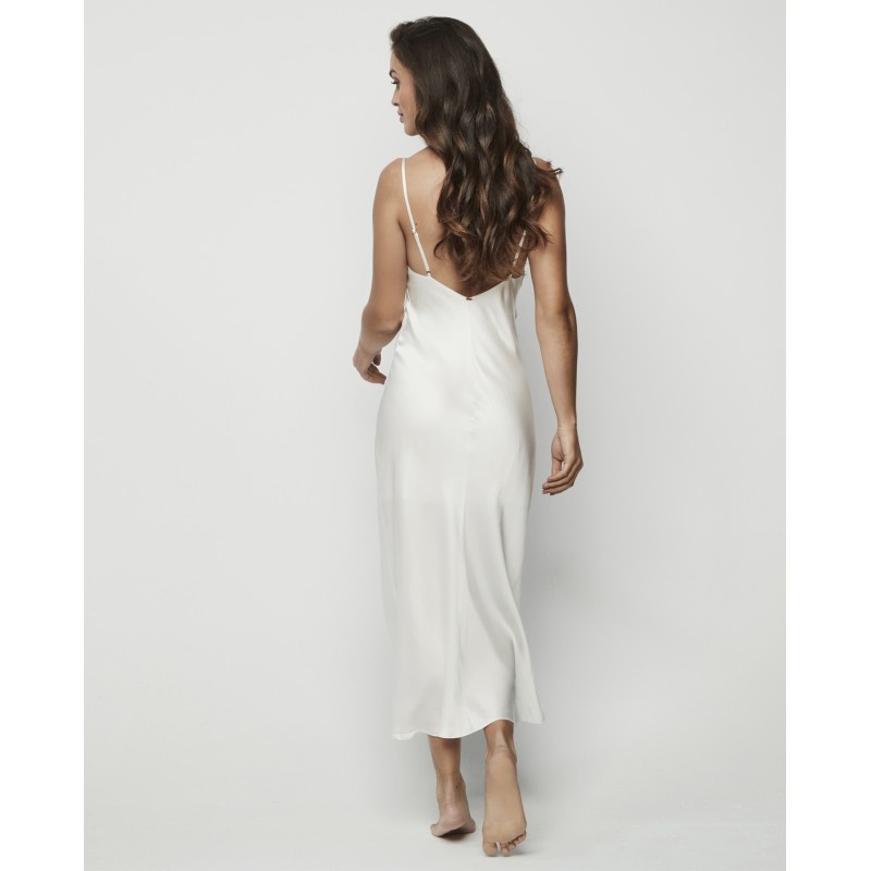 Camisón lencero largo con escote pronunciado en pico, espalda descubierta, y tirantes regulables. Cuenta con forro interior y abertura en un lado. Se trata de una prenda delicada y sofisticada. La colección Agatha, a la que pertenece, encarna la madurez y el esplendor de la marca, ofreciendo piezas que no solo adornan, sino que transforman. Una colección con encanto y carisma.