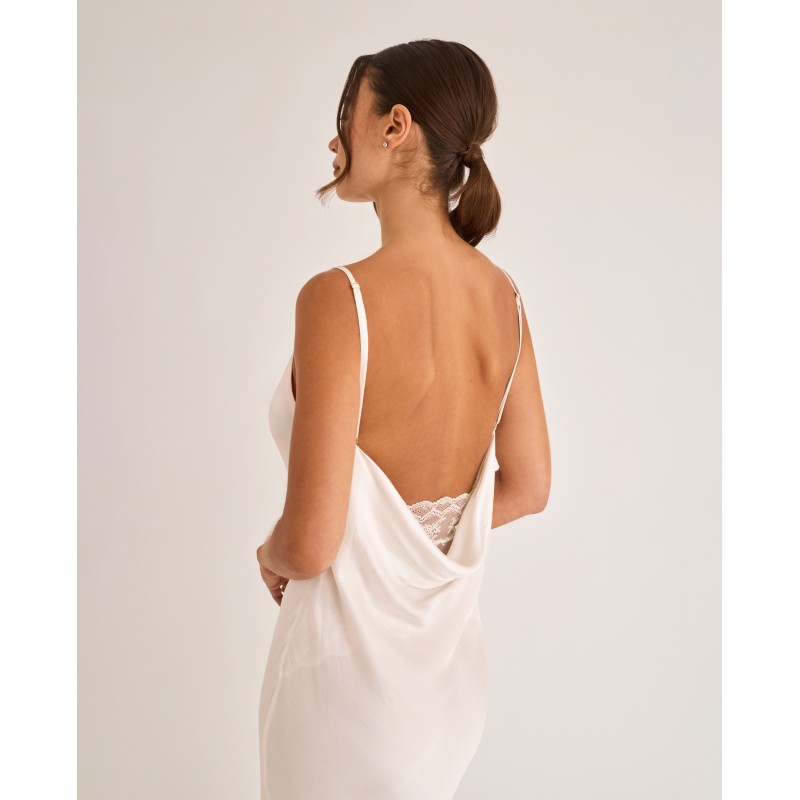 Camisón lencero corto con escote pronunciado triangular y tirantes regulables. Combinado con detalles de encaje y corte halter en la parte trasera. Es una pieza que fusiona elegancia y confort, diseñada para mujeres reales, libres y seguras. Pertenece a la colección Manuela, pensada para realzar la belleza que nace desde dentro celebrando la autenticidad de cada mujer. Para quienes quieren sentirse no solo bellas, sino cómodas y seguras en su propia piel.