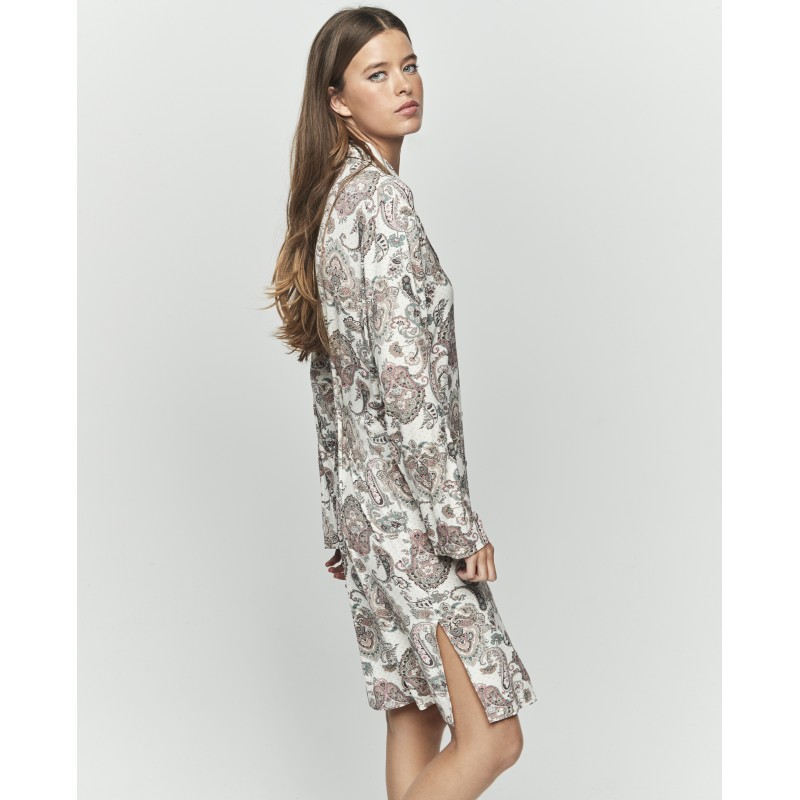 Camisón estilo camisa con mangas y largo hasta las rodillas y con botones al frente. Relájate con estilo con este camisón clásico que gracias a su exquisito estampado combina elegancia y comodidad para tu descanso.