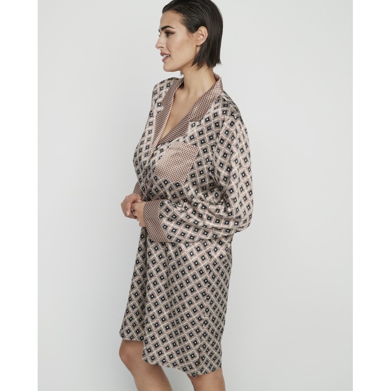 Camisón estilo camisa con mangas y largo hasta las rodillas y con botones al frente. Con este exquisito estampado cada noche se llena de encanto y sofisticación.