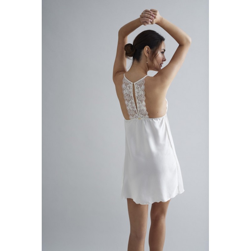 Camisón de tirantes de estética muy atractiva y con carácter. Su combinación con la blonda floral en escote delantero y trasero lo convierte en un modelo especial a la par que muy actual y juvenil.